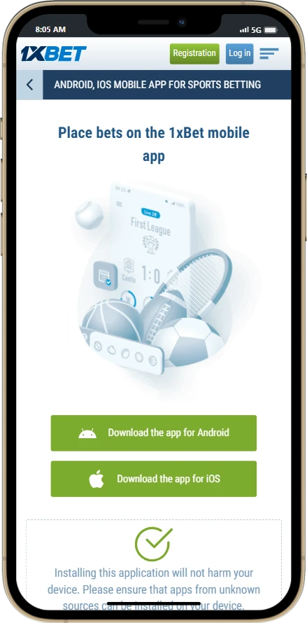 - ابدأ التنزيل: قم بزيارة الموقع الرسمي لسطح المكتب 1xBet وانقر على أيقونة المناسبة لجهازك – خيار Android أو iOS. إذا كنت تستخدم هاتفًا محمولاً يعمل بنظام التشغيل أندرويد، فقد تحتاج إلى تمكين تنزيلات ملفات الجهات الخارجية في إعدادات جهازك إذا لم يبدأ التنزيل على الفور. بالنسبة لنظام التشغيل iOS، ستتم إعادة توجيهك إلى صفحة Apple App Store الرسمية لتطبيق 1xBet.